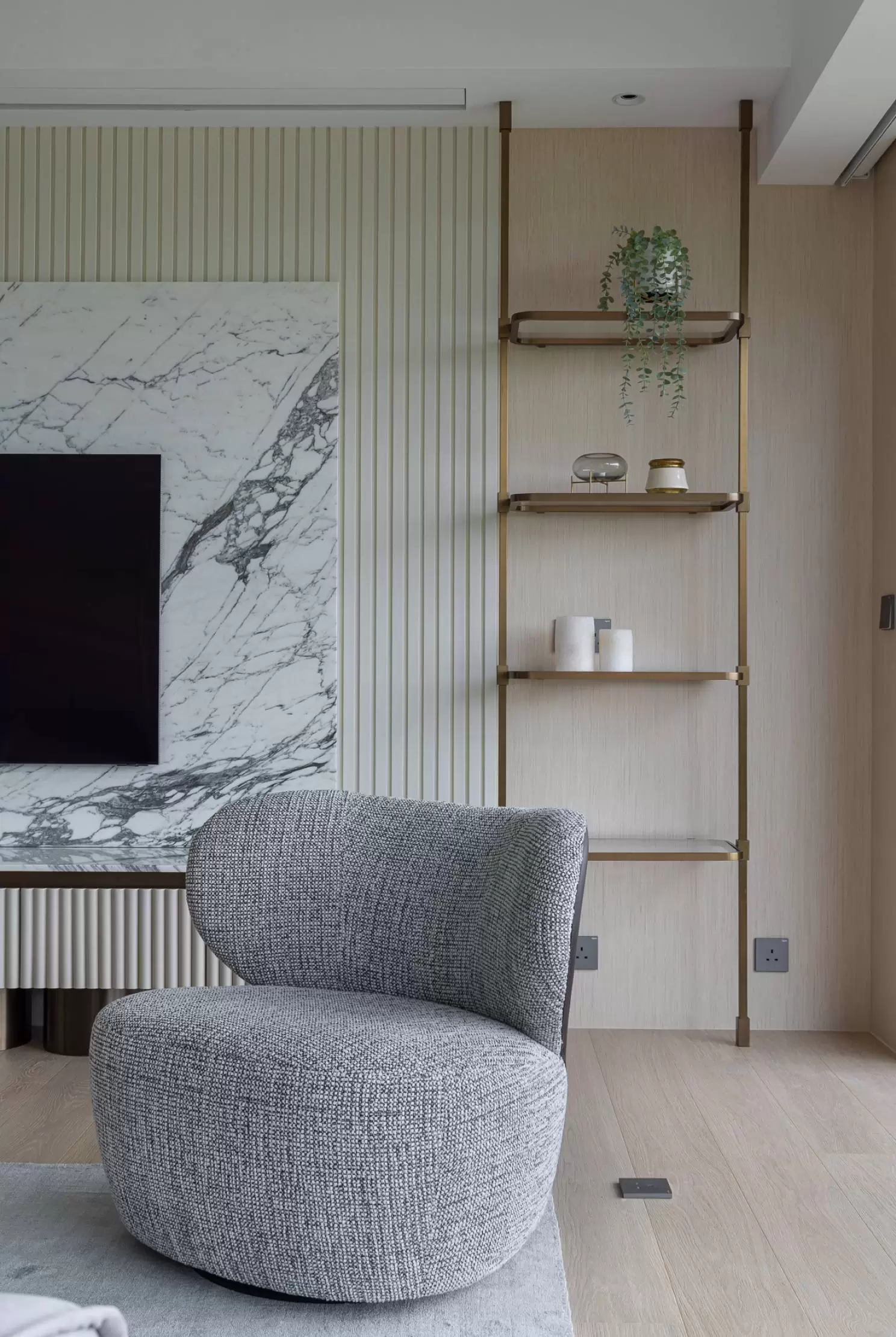 Running through the space with natural light wood pieces, the nitty gritty and texturized designs became the soul of this home. Inspired by the Italian style of luxury material as the core, designer imbued marble, bronze, suede, and unique glass into the space, while some wood-stripe patterns and bespoke details resounding to different corners, recreated this subtleness under a high-end setting.