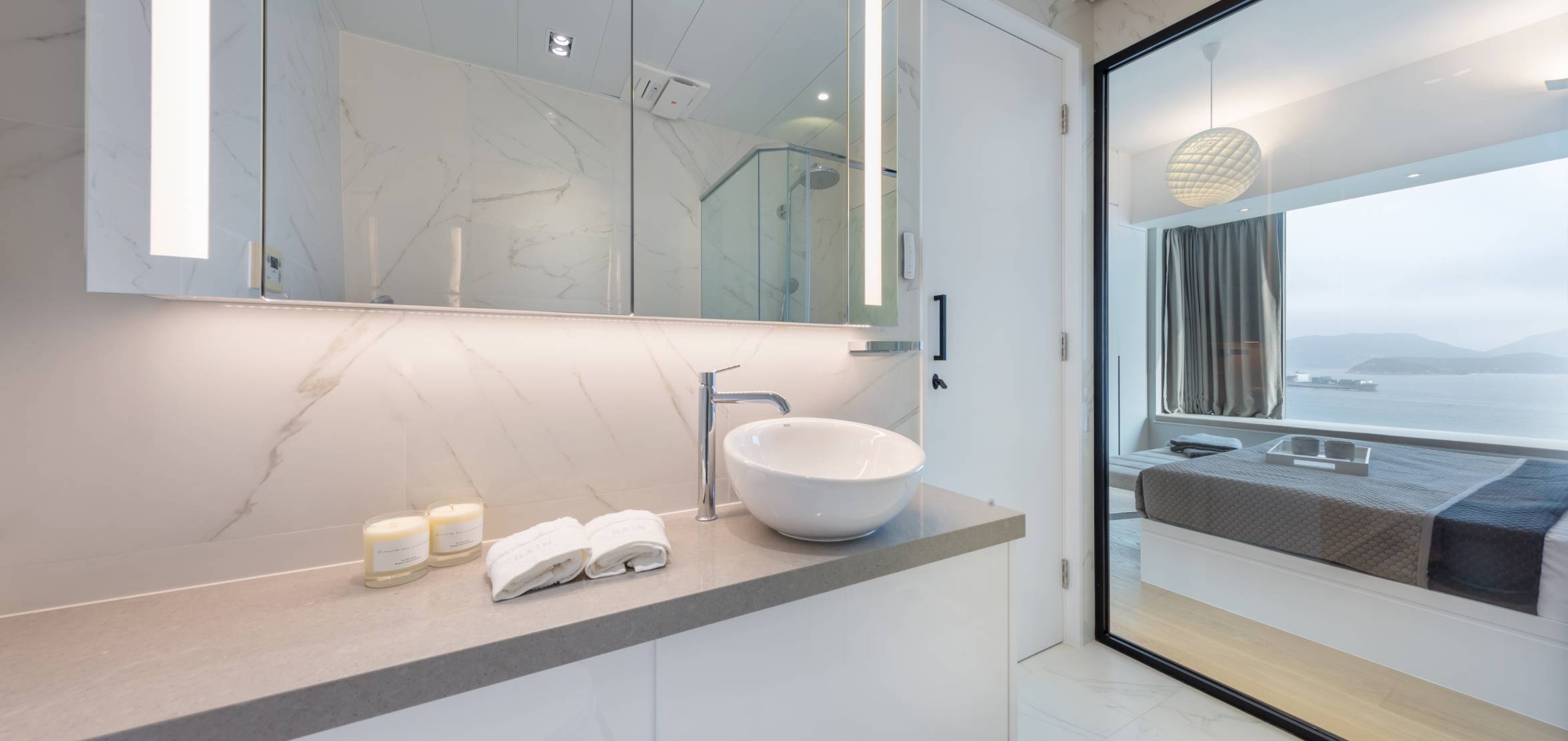 To create a resort-like living experience, wallpapers with the theme of the ocean are selected for the dining room, which can further match the Seaview outside. Changing the guest bathroom to a semi-open plan, natural lighting can be brought into the house, and let the owners at every corner of the house.