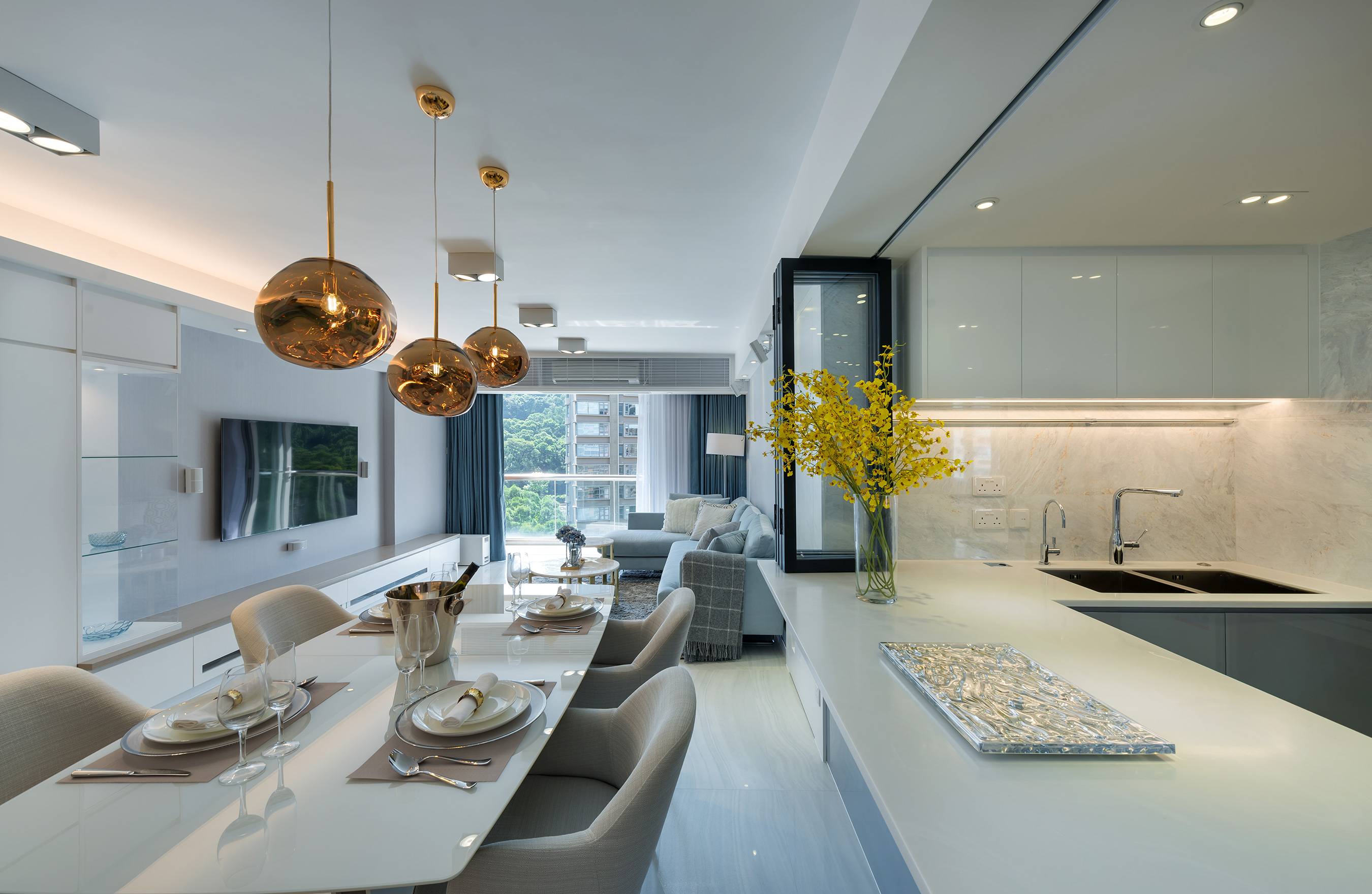 设计师尝试为聚龙居项目打造互动可变的室内空间。透过将厨房固有封闭式空间改为富机动性的框架组合,让居住者可以因应不同需要而调整合适场景。单位以现代风格融合简约花线设计,为室内空间营造既摩登时尚,又不失优雅的温馨氛围。