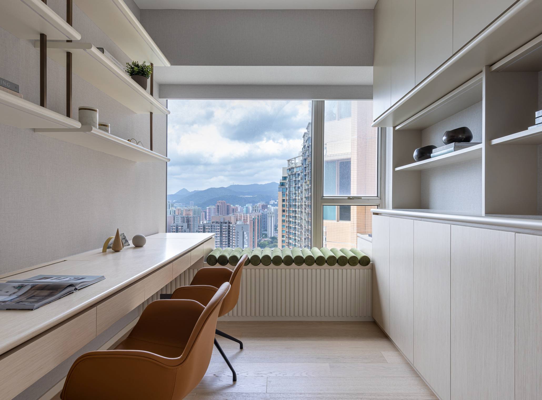此外,設計上保留了另外兩個房間,同樣以一片淺木色貫徹,結合了木條子及絨布床頭板,層板睡床的設計有效地善用和節省空間,能夠增添置頂的儲物收納櫃增加收納空間,以及一些帶有陳列架的工作枱,打造一個恬靜舒適的休息睡房。