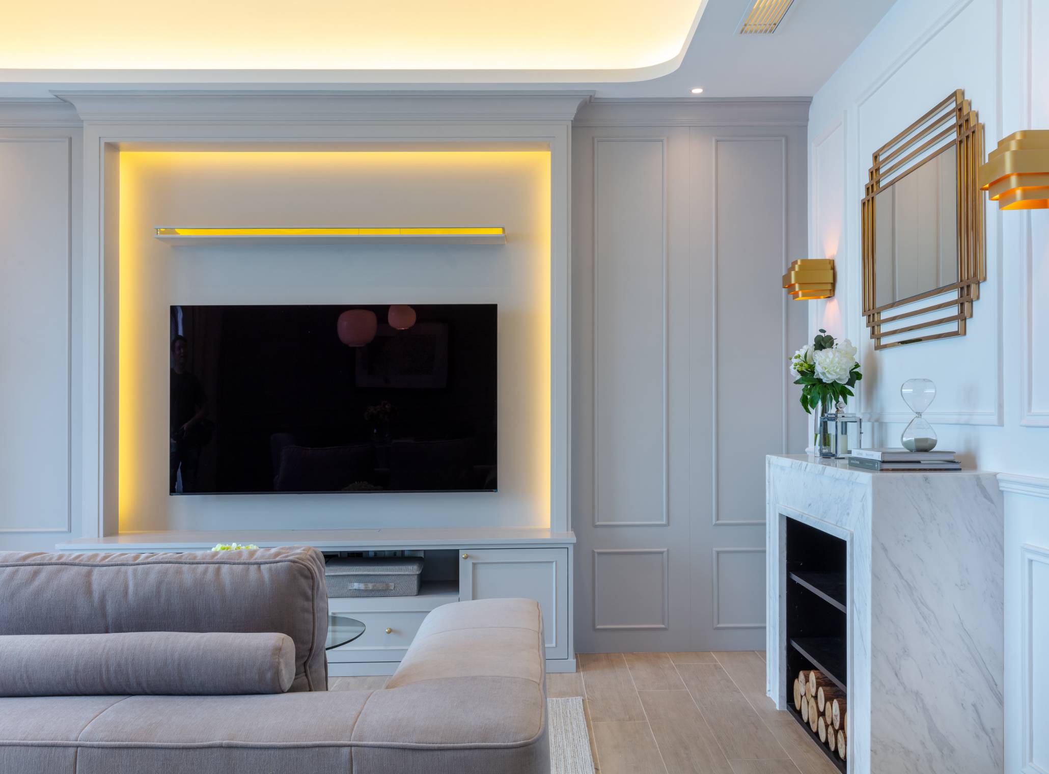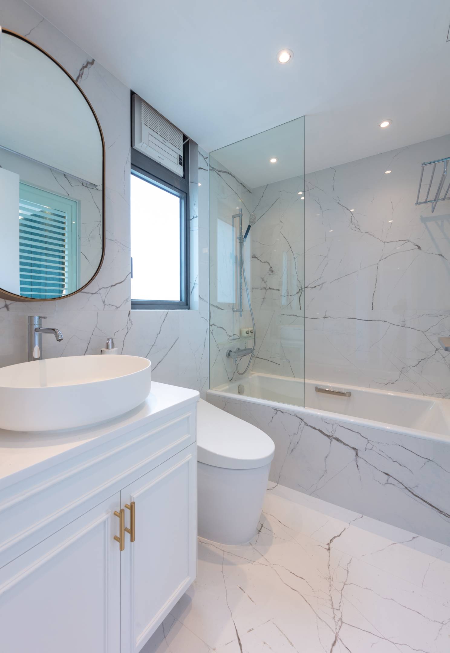單位位處臨海地段,設計師刻意以藍、綠色調連貫室外絕美景致。開放式廚房位於室內角落位置,設計刻意透過弧形線條串連客、飯廳及廚房空間,為戶主規劃生活動線。設計師又將書房重新開則,改以雙趟門作為書房入口,將室外臨海景觀盡收室內每一吋空間。主人房則與旁邊客房以一道趟摺門分隔,除可擴大主人套房空間,同時亦保留靈活間隔之需要。