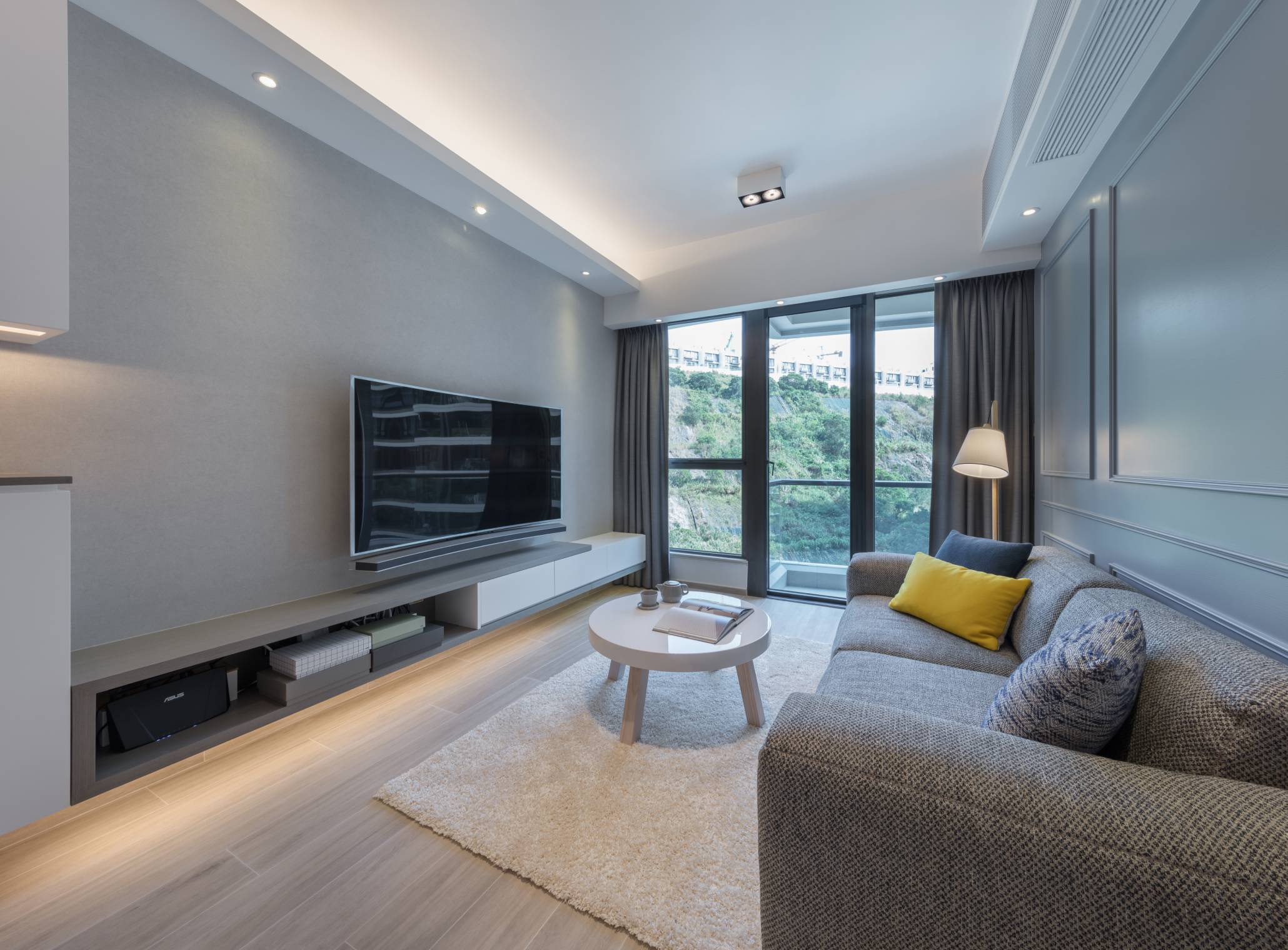 設計師以現代歐式風格塑造此一位於玖瓏山的全新單位。單位依山而建,透過半開放式空間規劃,令戶主於室內可盡享戶外亮麗光線與山林景致。全屋以灰藍色作為創作主調,並以客廳一幅連貫式歐式花線牆身連隱藏門設計,簡單為開放式單位區分主要空間及用途。飯廳位置則以中島櫃取代傳統用餐佈局,成為戶主每天享受靜瑟生活的起點。