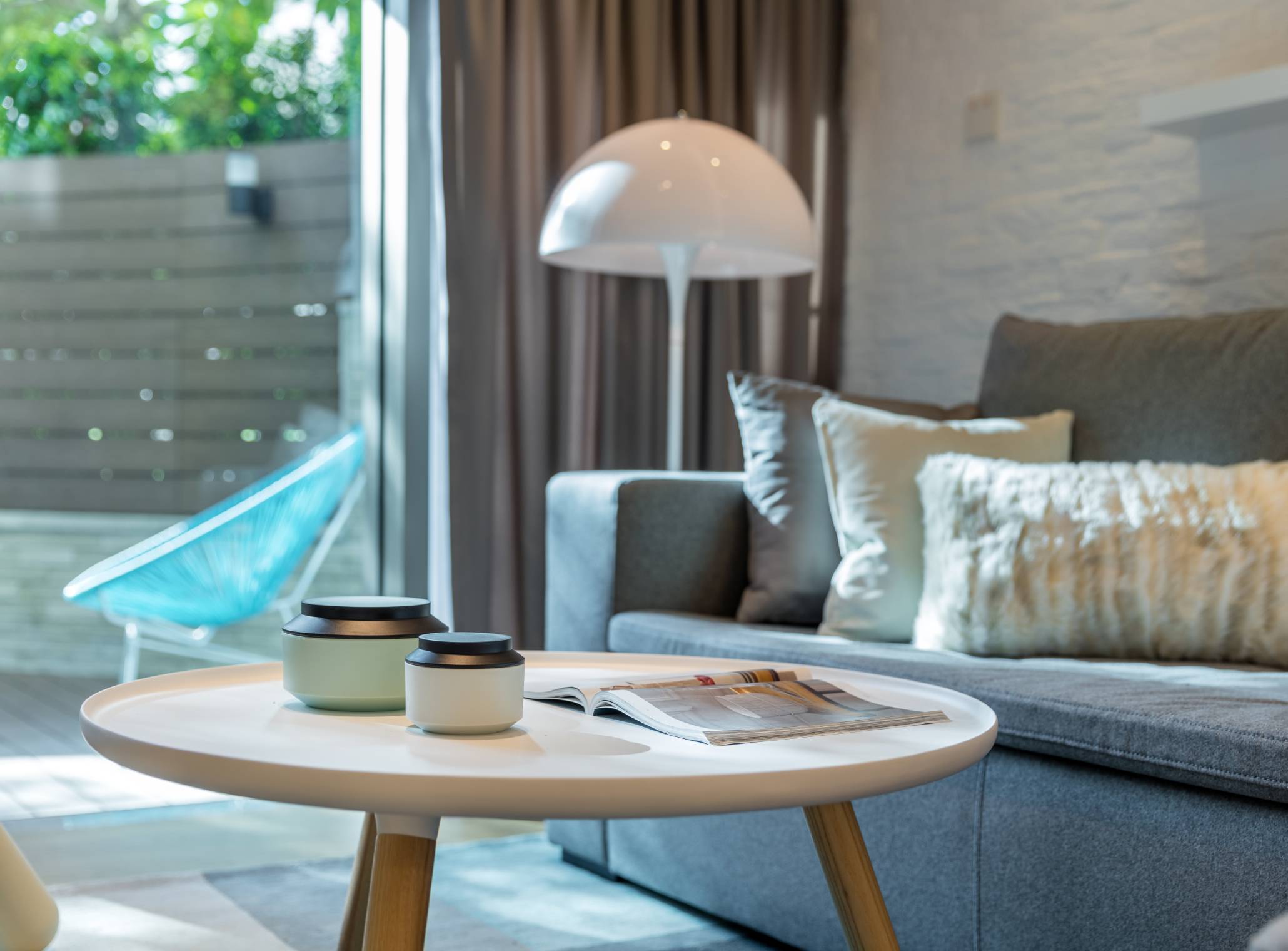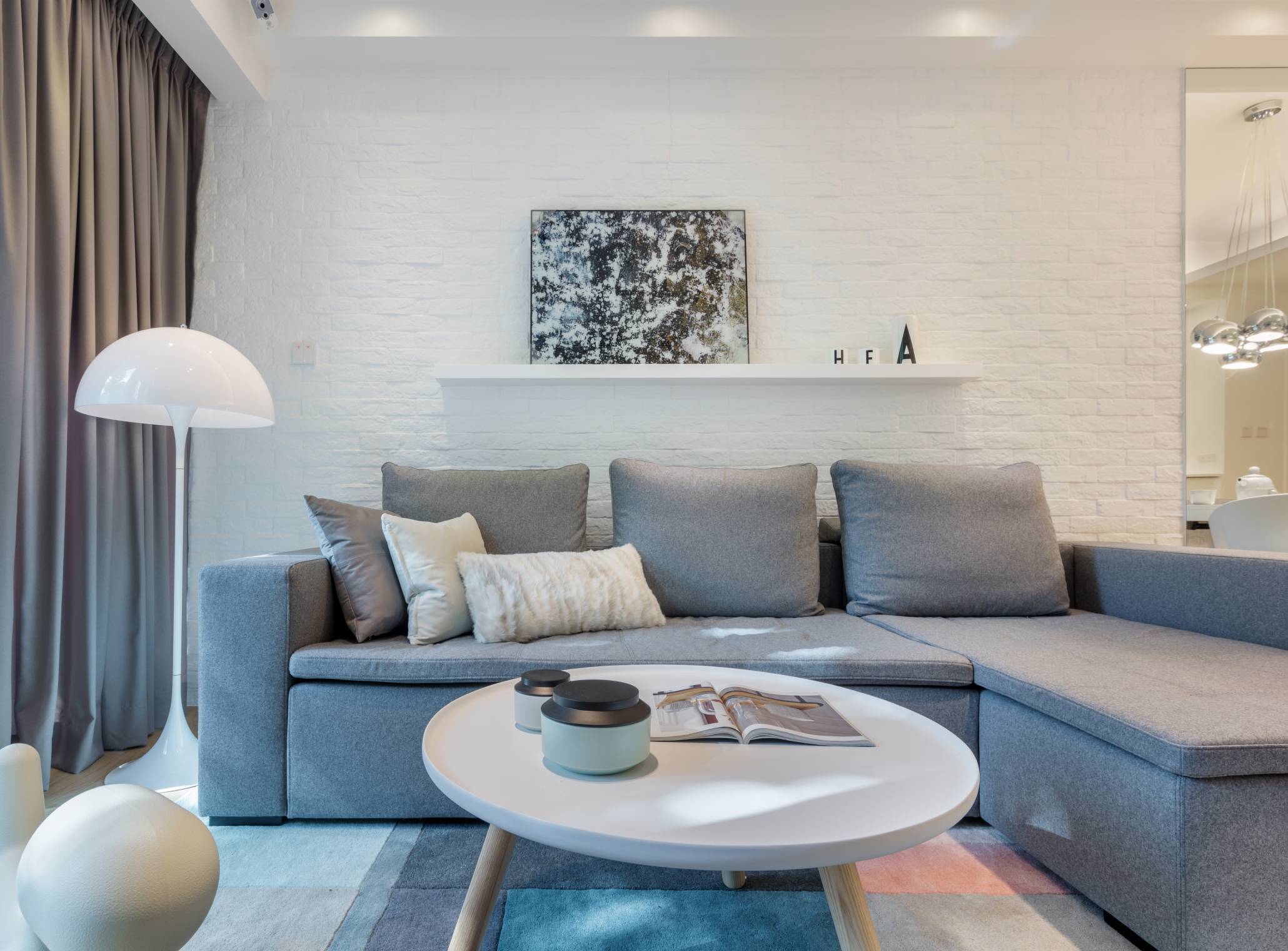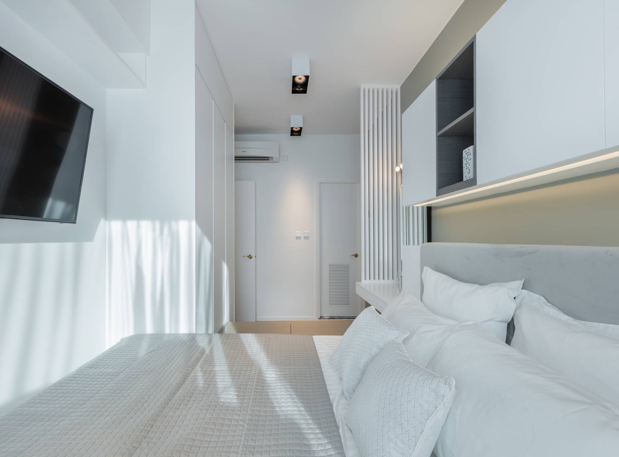 戶主崇高簡約自然,故此設計師以淺灰、白為單位設計主調。配合較矮身傢俬,令屋外自然光能充分照進屋內,提升自然氣息。主人房貫穿主題,以白、灰為主色之餘,配合淺灰色木地台,呼應自然舒適主題外,更增添儲物空間。