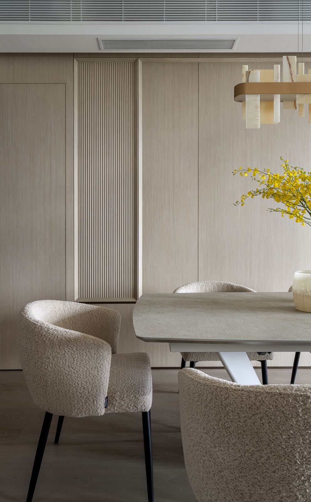主要以樸質感濃厚的實木遊走空間每個角落,設計捕捉戶外懾人的山海景觀,以木材作為基調重新呈現大自然的溫度與質感。為了配合這對夫婦與小狗的生活模式,空間的大部分牆身運用了飾面及厚實的牆紙打造,以提升居室耐用的功能;空間的天花逐以弧線修飾橫樑,配合燈槽滲光效果在大自然的氣息之中滲透一抹現代感。設計需要重整間隔,拆下了一間房間歸納為客飯廳之中,以暗門的形式連接主人房,營造一幅特色牆把空間的張力逐漸延伸。